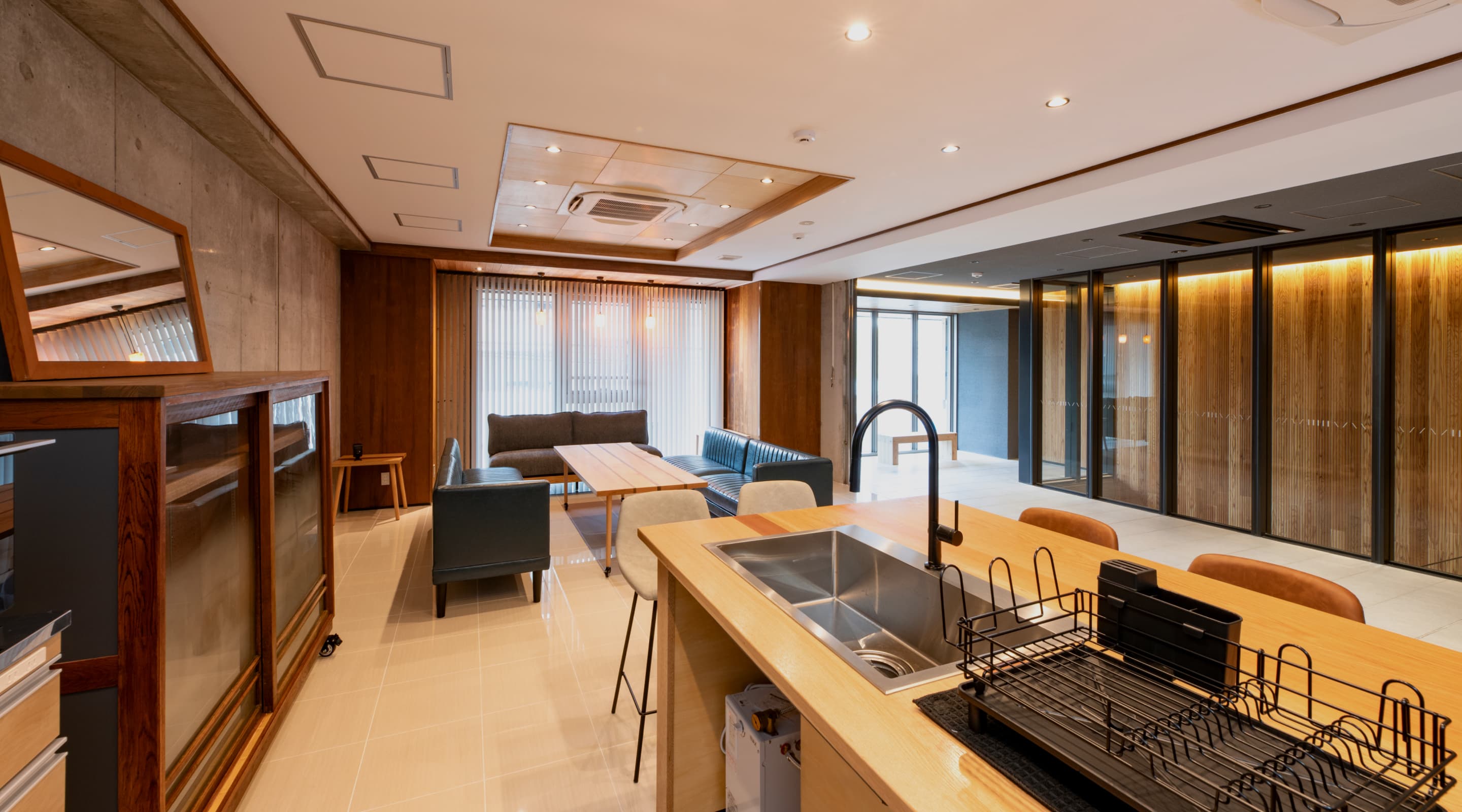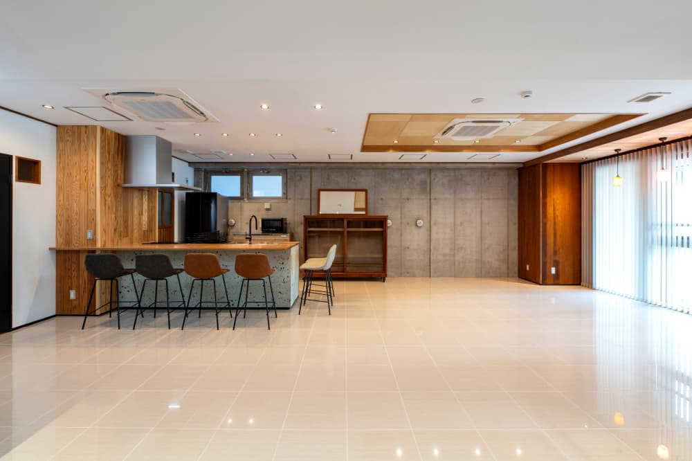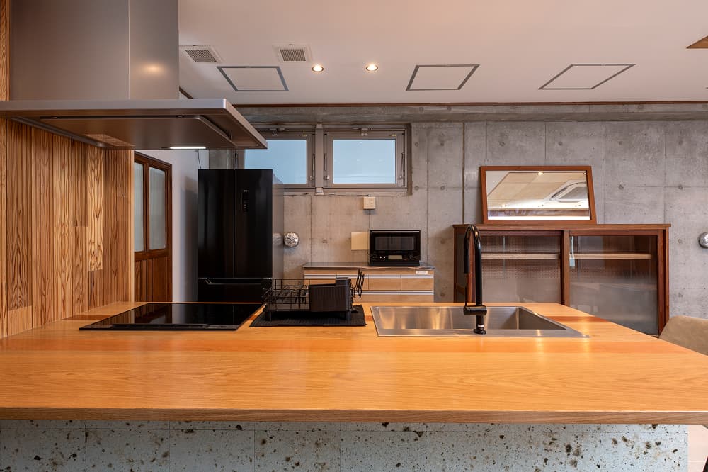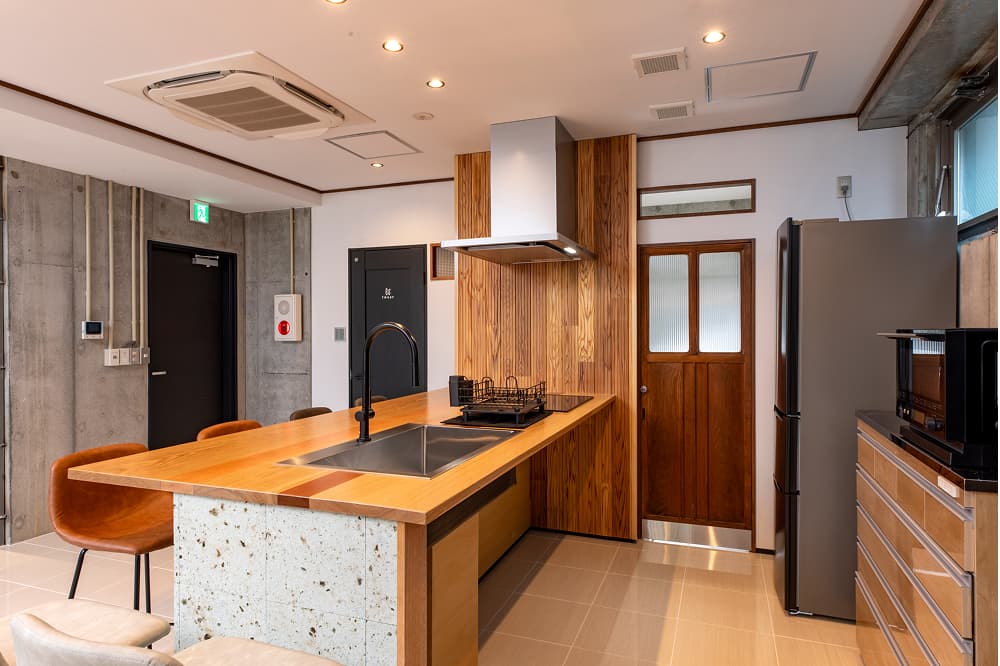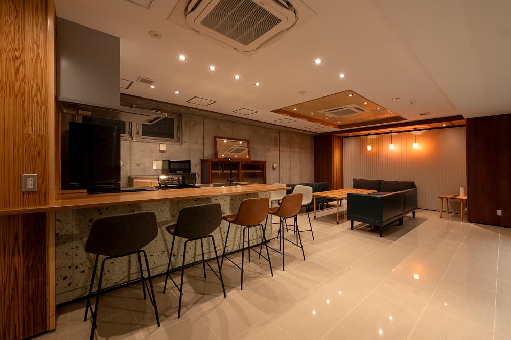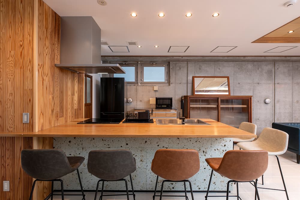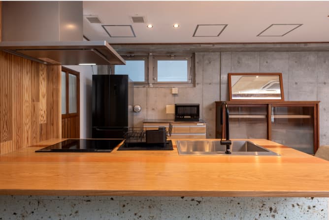 木製カウンターキッチンをはじめ、リラックスできるレンタルスペースとなっています