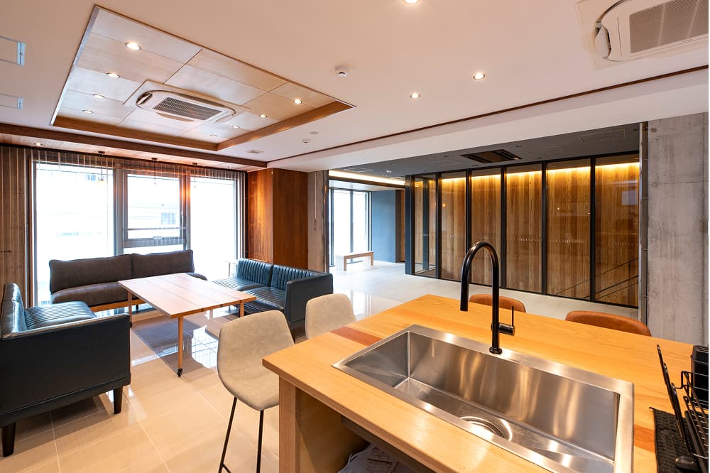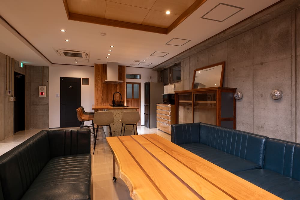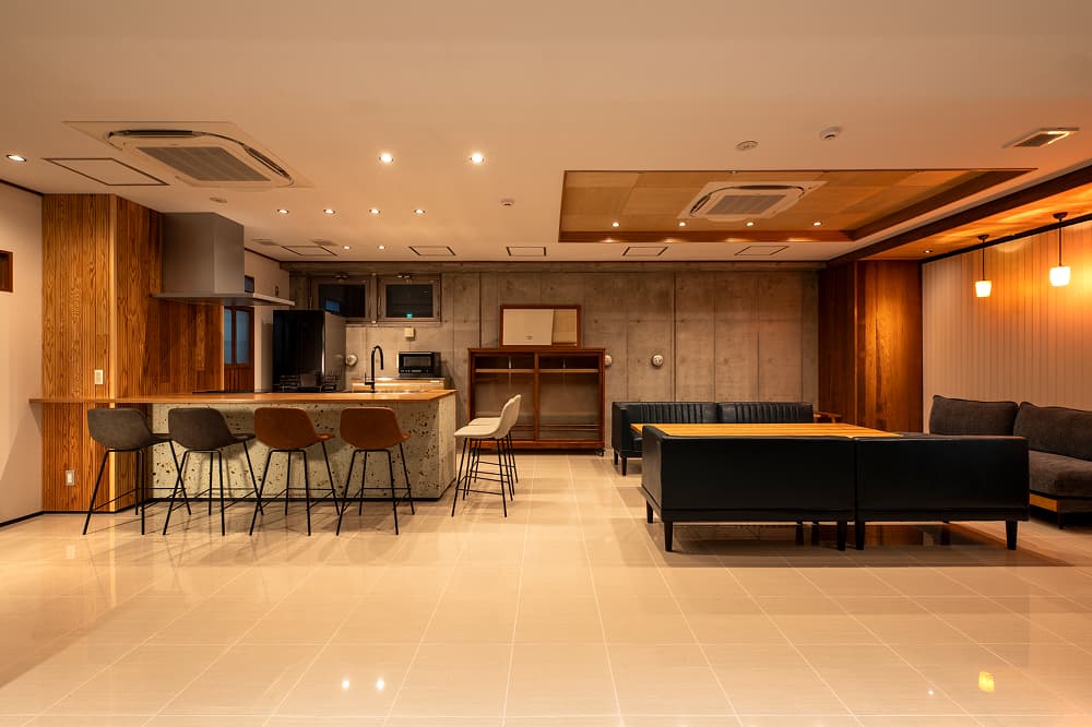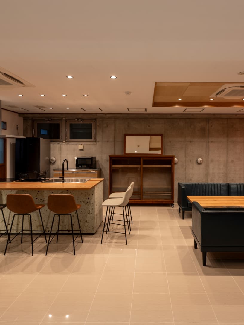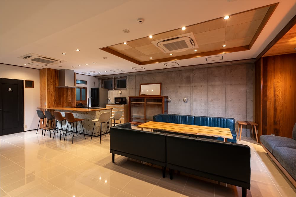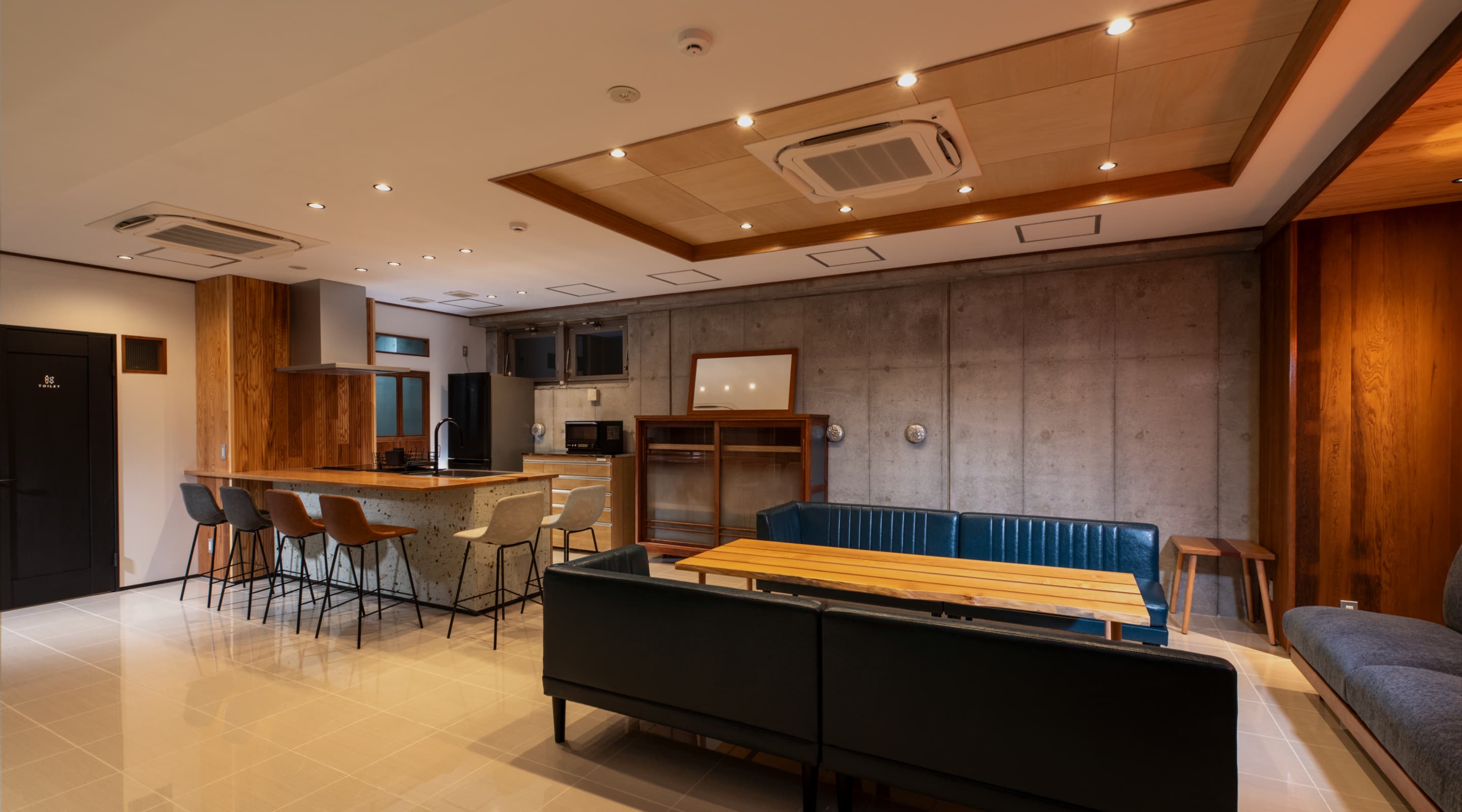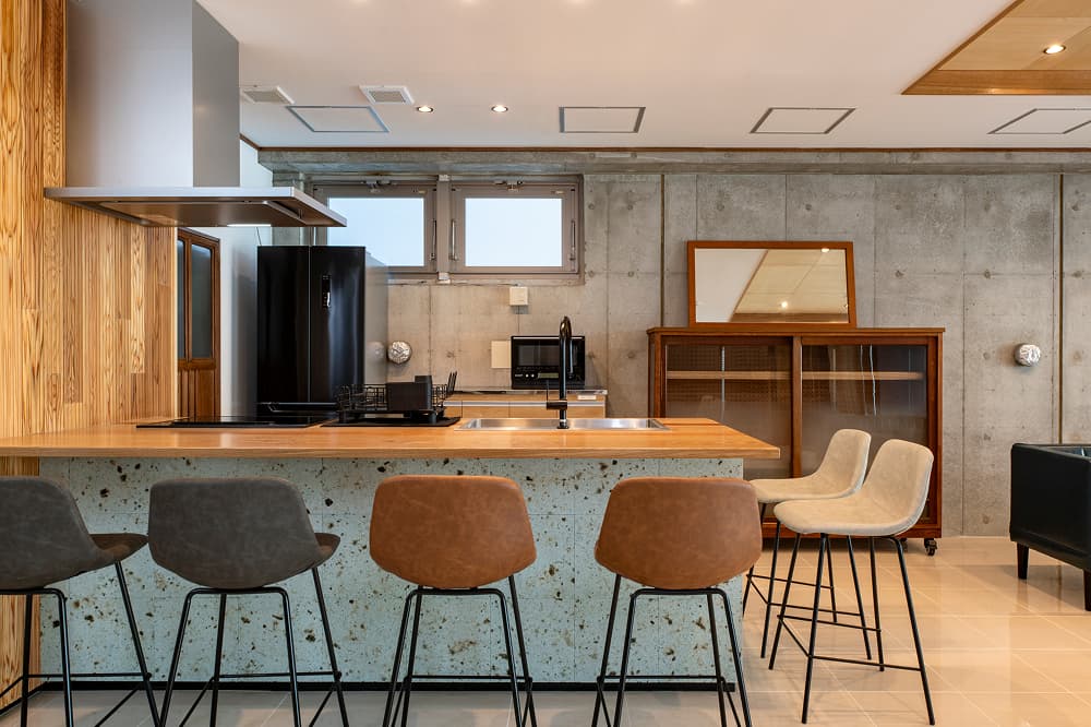 木製カウンターキッチンをはじめ、リラックスできるレンタルスペースとなっています