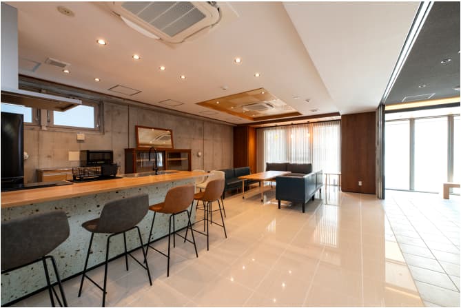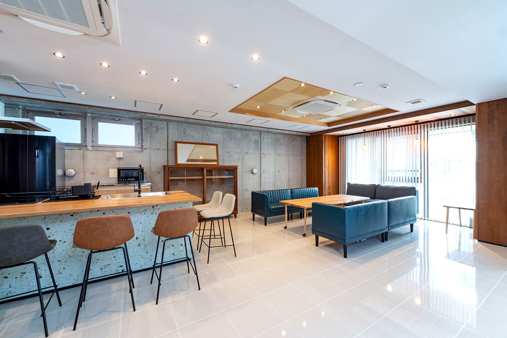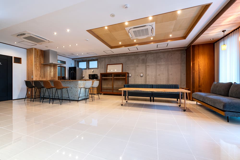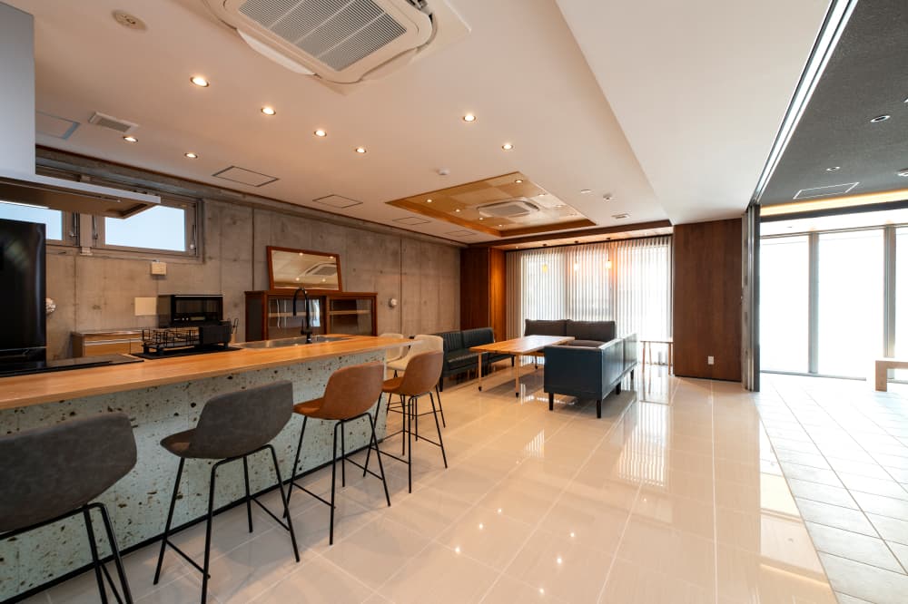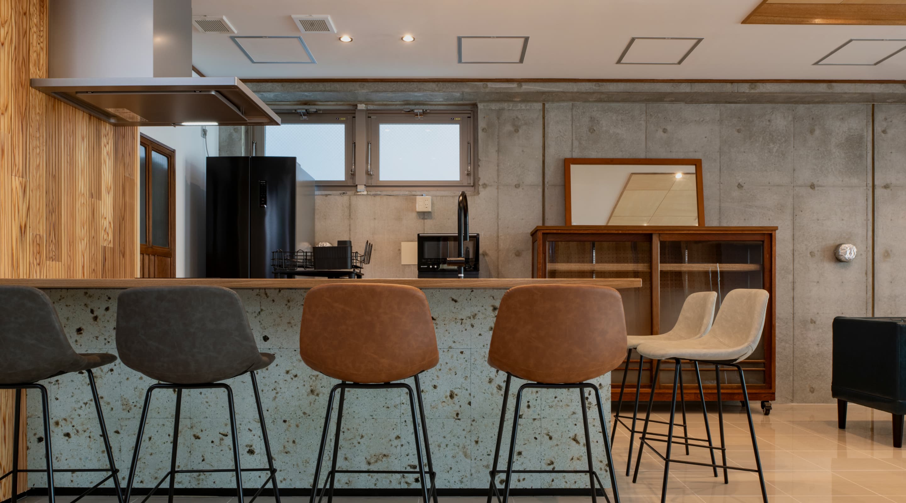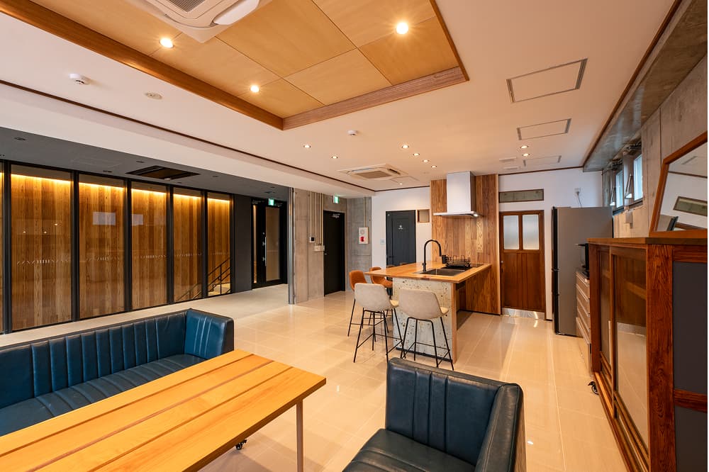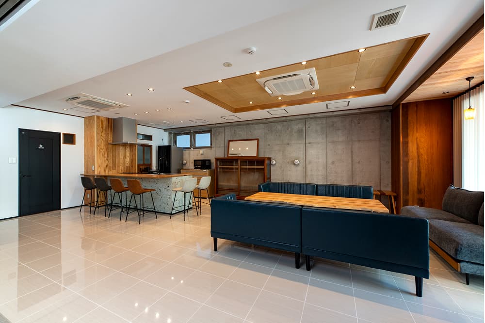 木製カウンターキッチンをはじめ、リラックスできるレンタルスペースとなっています