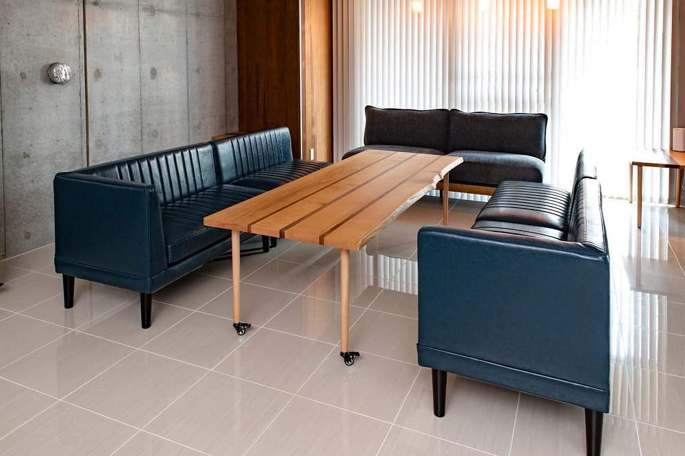 無垢材のインテリアは可動式、ソファーも移動して備品の丸イスを配置すれば、小規模なセミナー等にも対応しています