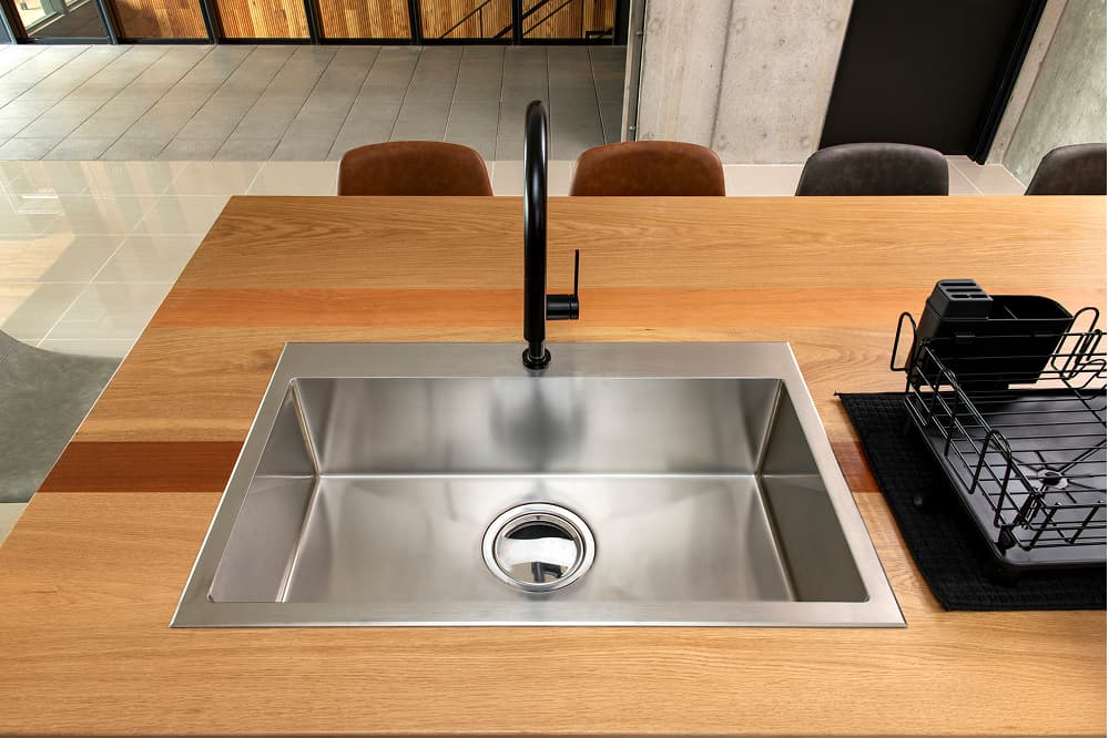 ぬくもりを感じさせる無垢材の天板と大谷石のカウンターキッチン