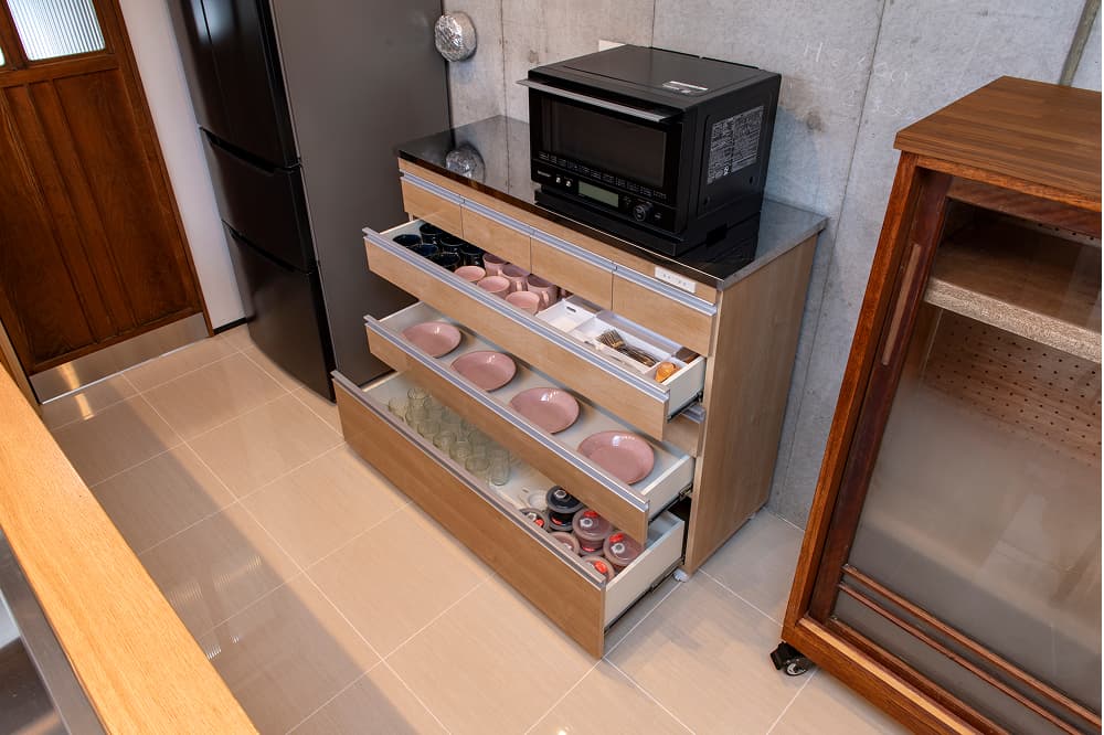 キッチンまわりにはIHコンロ、冷蔵冷凍庫、電子オーブンレンジ、食器収納と機能的に配置、食器や調理器具も各種取り揃えています