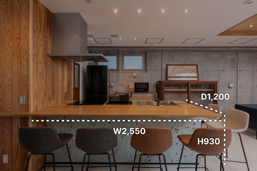 - W2,550mm×D1,200mm×H930mm 正面カウンター(パイプシャフト部分)+560mm